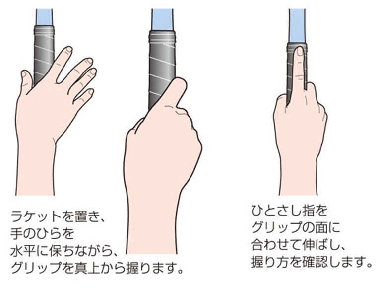 グリップは、その握り方により上達のスピードが変わるほど重要なポイントです。まずはソフトテニスの基本グリップであるウエスタングリップをしっかりと身につけてください。上達に従い、サービスなどでグリップを変える人もいますが、ウエスタングリップならフォアハンド※もバックハンド※もすべてのショットに対応可能です。