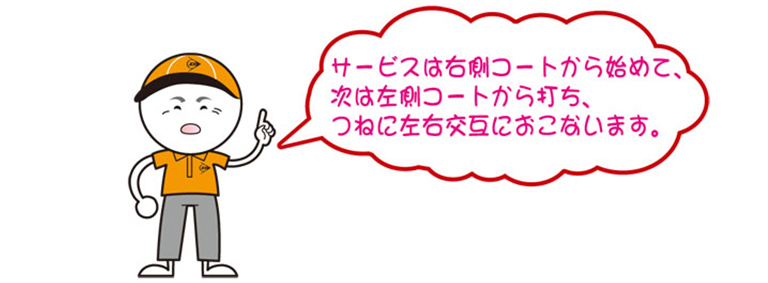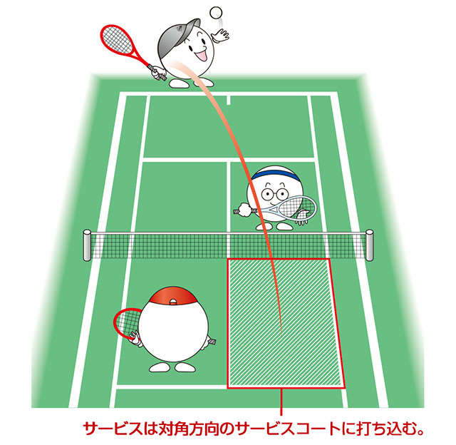 ゲームはすべてサービスから始まり、左右どちらかのコートの外から、対角線上の相手側サービスコート内にボールを入れなければなりません。サーバー(サービスを打つ人)は、ファーストサービスが失敗(フォールト)してもセカンドサービスを打つことができます(入らなければダブル・フォールトで失点)。
