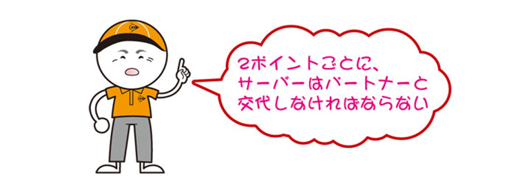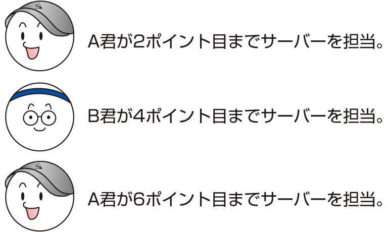 ダブルスの場合は、サーバーは2ポイントごとに交代し、同一ゲーム中に、その順番を変えることはできません。ただし、次のサービスゲームは順番を新たに決めることができ、その後は同様に勝敗が決まるまで2ポイントごとの交代を繰り返します。