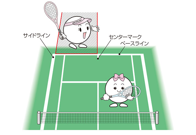 サービスをする時のサーバーのポジション(位置)は、左右どちらのコートでもサイドラインとセンターマークの間と決まっており、ベースラインの外側からサービスをおこないます。