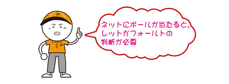 サービスのボールがネットなどに当たり、相手側のサービスコートに入った場合は、レットとなり、ファースト、セカンドを問わずサービスをやり直します。