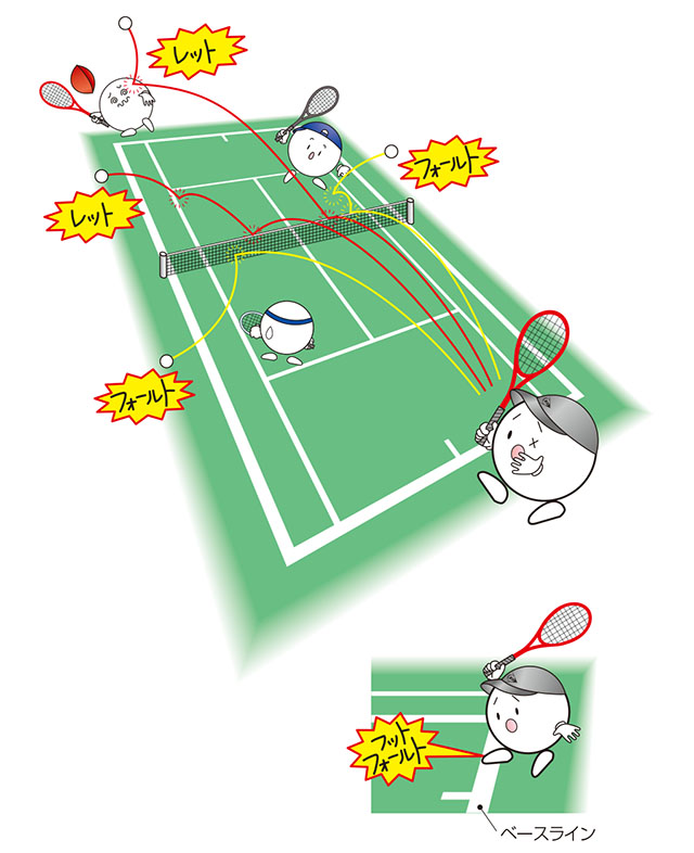 またベースラインにサーバーの足が触れた場合(フット・フォールト)やトスのやり直しもソフトテニスではフォールトになるので注意してください。