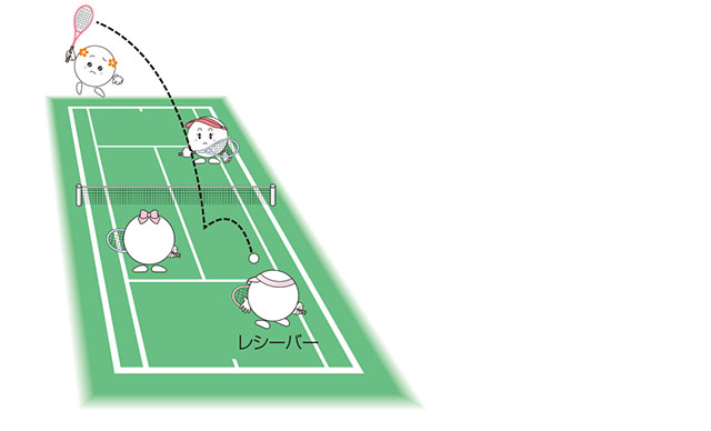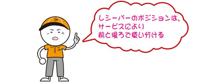 レシーブがしやすいように、レシーバーは自由にポジションをとることができます。ただし、ファーストサービスの時は、強くて速いサービスが打ち込まれることが多いので、ベースライン付近を基本にします。