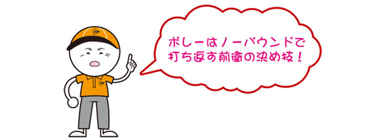 グランドストローク中心の後衛とは異なり、前衛は積極的にポイントを狙っていかなければなりません。そんな前衛の武器でもあるボレーは、ラケットのフェイス面を前に押し出すようにして、ボールをノーバウンドで打ち返す攻撃的なショットです。スピードが速く、打つコースも良ければ確実にポイントがとれます。